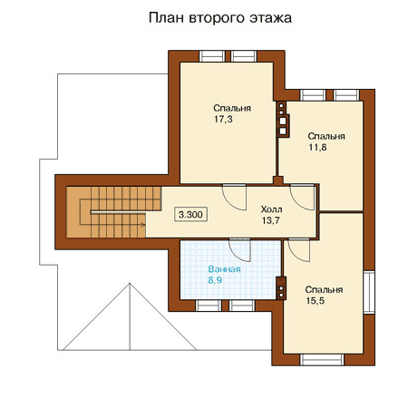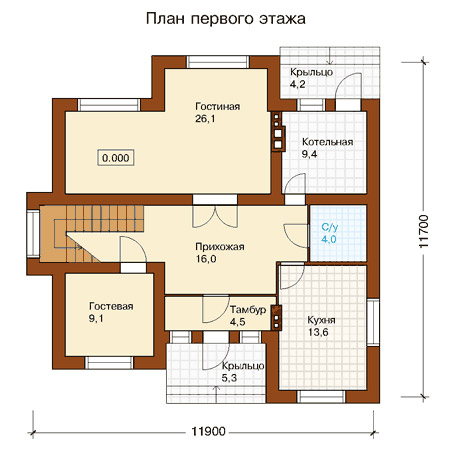 Уютный загородный дом будет служить прекрасным местом отдыха и жизни небольшой семьи. Многообразие внешнего облика дома задают его пластичные фасады в сочетании с удобной планировкой, благодаря чему, дом будет смотреться интересно с любой из сторон. Понижение кровли ко входу создает уют и психологический комфорт хозяевам , а также и гостям дома. Первый этаж дома располагает в себе просторную гостиную с камином, гостевую комнату, кухню и прихожую. Второй этаж предназначен для отдыха членов семьи и вмещает в себя три спальни и просторную ванную комнату. Данный коттедж возможно построить из кирпича или пенобетона. В качестве наружной отделки коттеджа может быть применён облицовочный кирпич или штукатурка с последующей покраской.